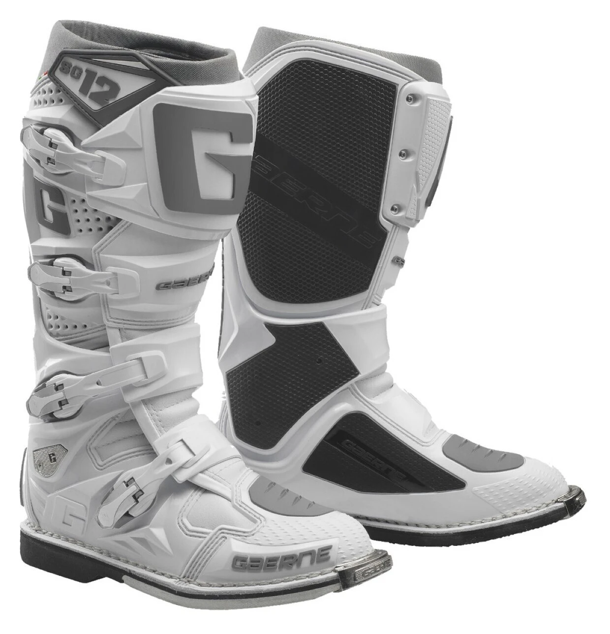 Gaerne continues to kill the game with their pro-level Motocross boot, the SG-12. The revolutionary design of the Dual Stage Pivot System is patented and exclusive to Gaerne, assuring it to be a success. The first pivot is attached to the “razorback”, which provides a rigid component and offers strong lateral support while a glideplate keeps the upper in a firm, upright position. The SG-12 utilizes four lightweight alloy buckles that attach to an adjustable strap. This is a “Tried and True” system that provides the rider with an “Easy in” and “Easy out” non failure system.